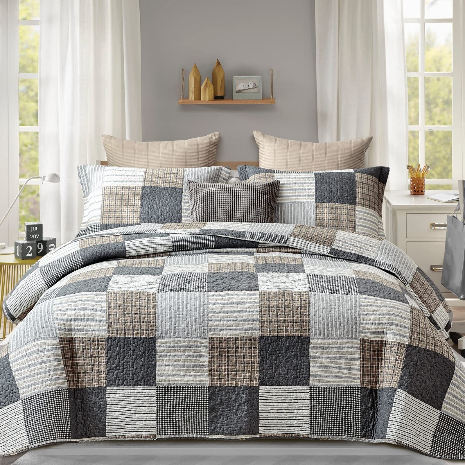 Grey Brown White Plaid Patchwork Soft Reversible Queen Quilt Set for Bed All Season, 3-Pieces