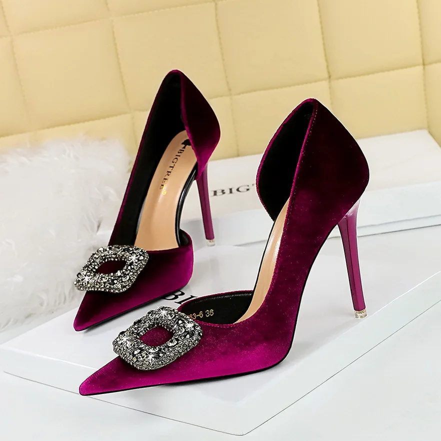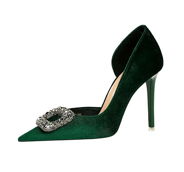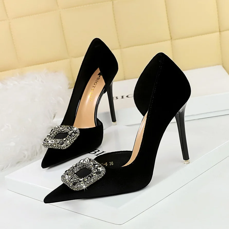 Plus size new styles pointy side hollowed-out metal rhinestones buckle suede stiletto party heels for ladies