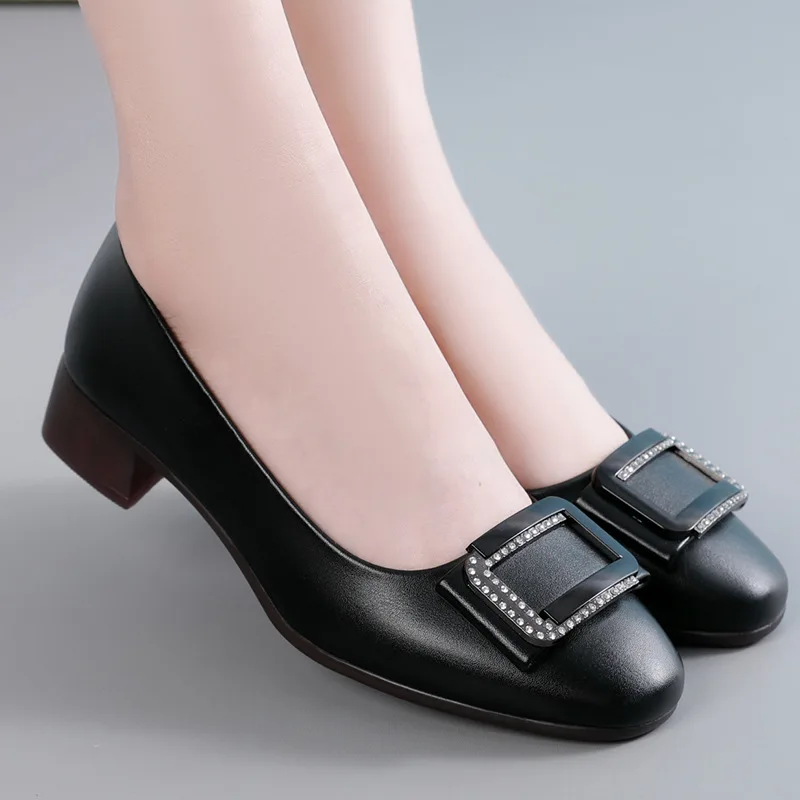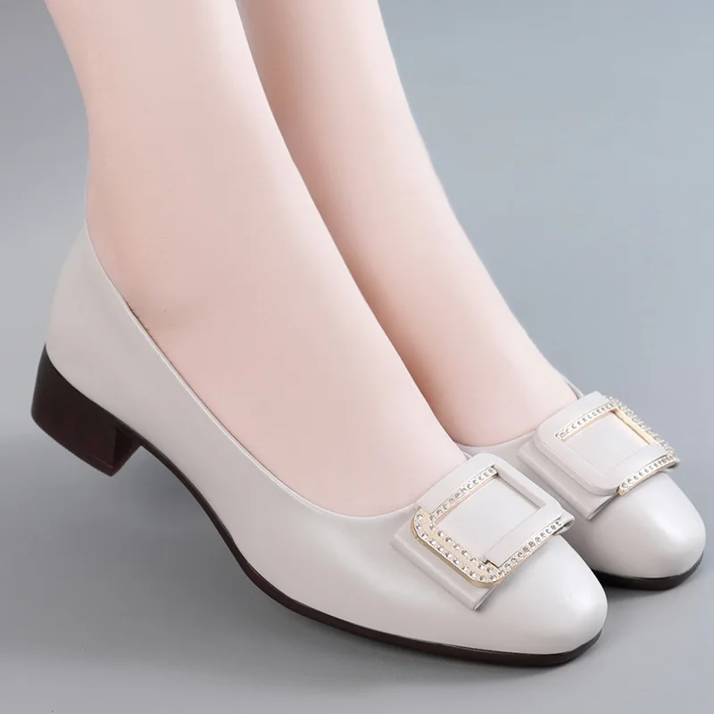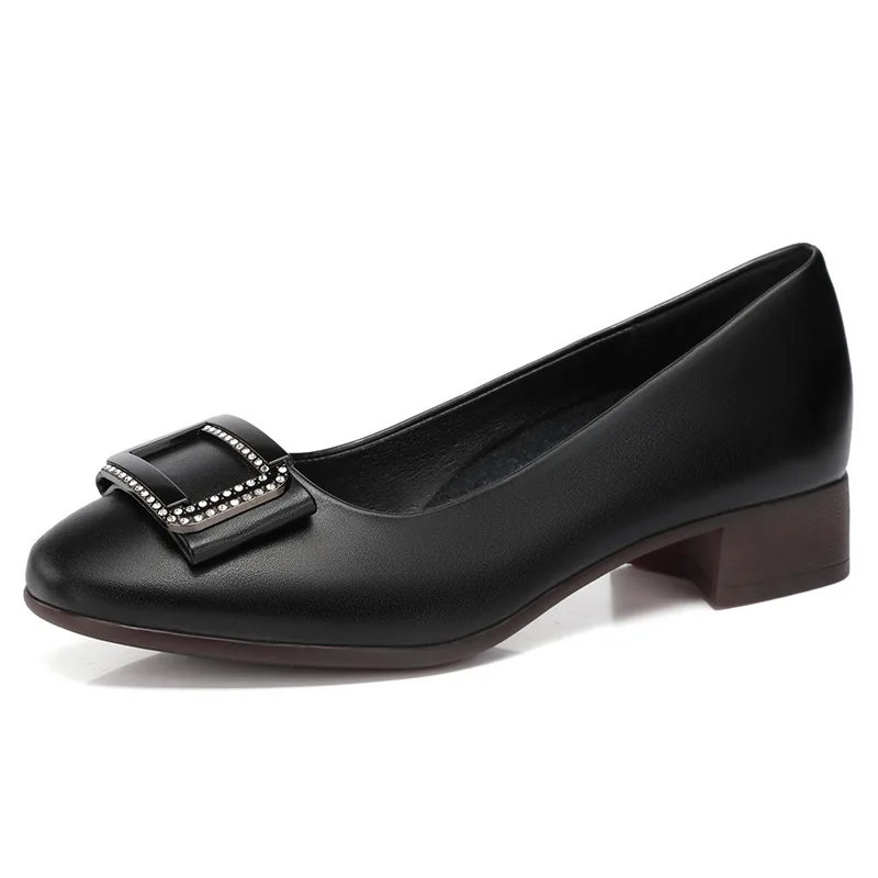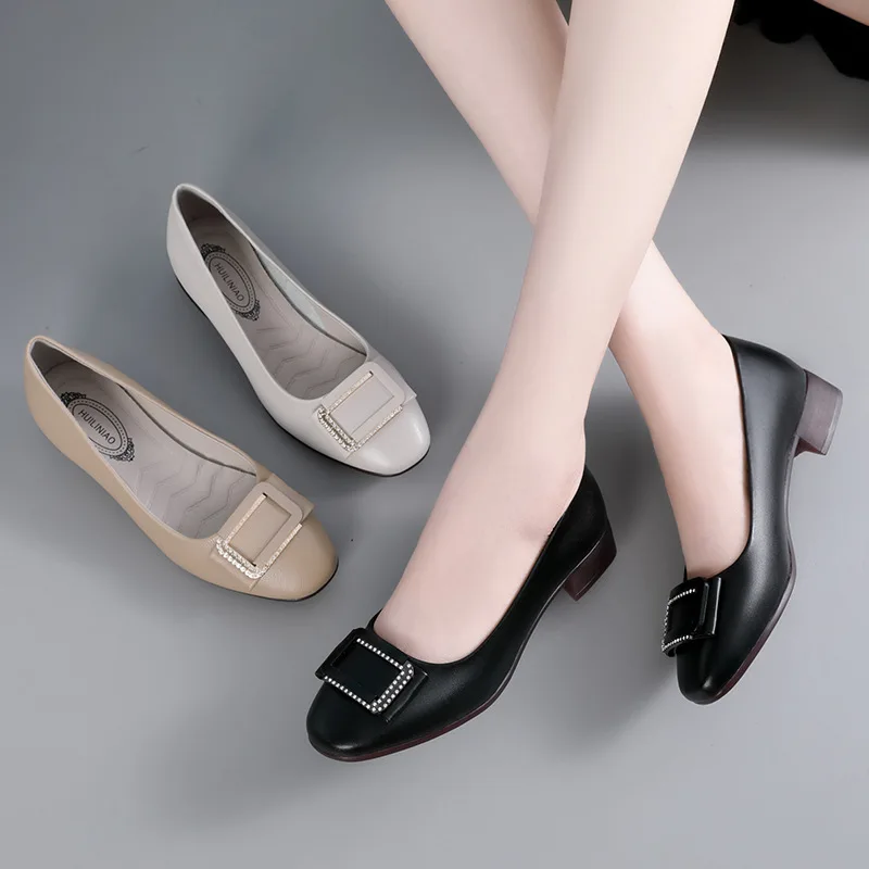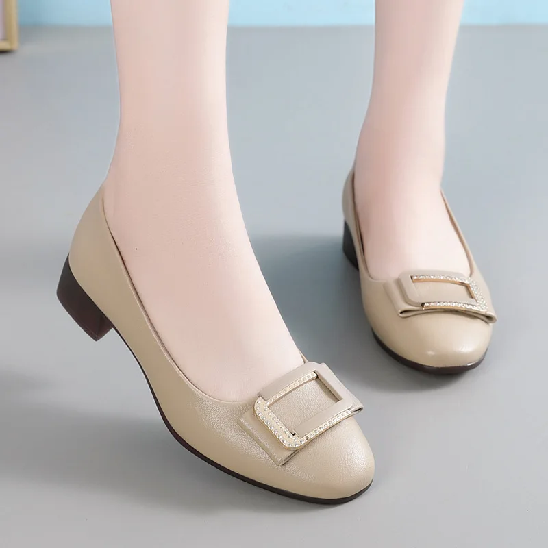 Round toe comfortable lightweight soft-soled mid-heels slip on casual genuine leather pumps shoes