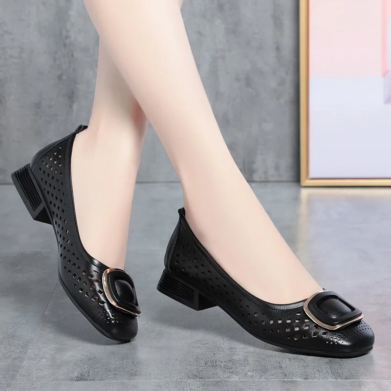 Spring summer hollow breathable bean shoes square buckle soft leather 2.5cm high quality flat shoes pumps for women