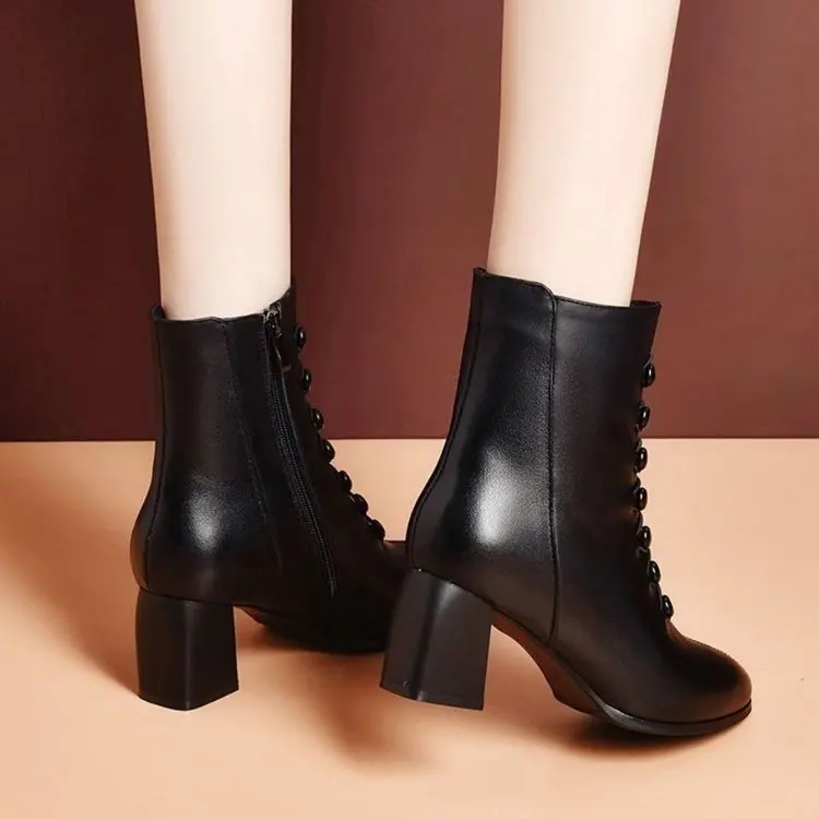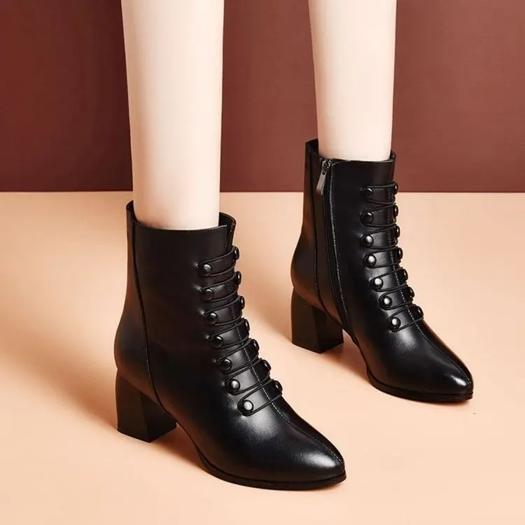 new design winter fashion side zipper leather warm soft sole thick heel shoes for women boots black