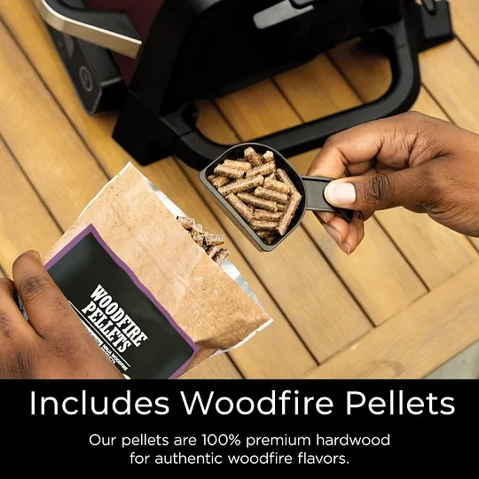 - Includes nonstick grill grate, Crisper Basket, Pellet Scoop, Woodfire Pellets Starter Packs